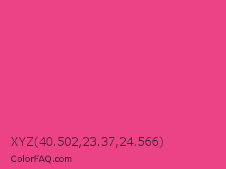XYZ 40.502,23.37,24.566 Color is a normal rose color and the nearest color is Cerise Pink #ec3b83. Hex code #eb4385 and RGB value is rgb(235,67,133). In RGB color space, this color is composed of 92% red, 26% green, 52% blue, In CMYK color space, this color is composed of 0% cyan, 71% magenta, 43% yellow , 8% black , In HSL color space, this color has a hue angle of 336° , 81% saturation and 59% lightness.
