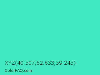 XYZ 40.507,62.633,59.245 Color is a normal cyan color and the nearest color is Turquoise #40e0d0. Hex code #42e8bf and RGB value is rgb(66,232,191). In RGB color space, this color is composed of 26% red, 91% green, 75% blue, In CMYK color space, this color is composed of 72% cyan, 0% magenta, 18% yellow , 9% black , In HSL color space, this color has a hue angle of 165° , 78% saturation and 58% lightness.