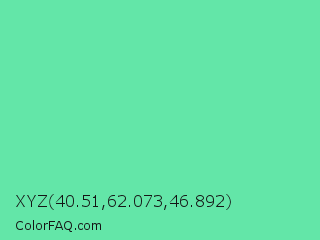 XYZ 40.51,62.073,46.892 Color is a light green color and the nearest color is Medium Aquamarine #66ddaa. Hex code #63e6a8 and RGB value is rgb(99,230,168). In RGB color space, this color is composed of 39% red, 90% green, 66% blue, In CMYK color space, this color is composed of 57% cyan, 0% magenta, 27% yellow , 10% black , In HSL color space, this color has a hue angle of 152° , 72% saturation and 65% lightness.