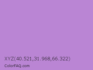 XYZ 40.521,31.968,66.322 Color is a light purple color and the nearest color is Lavender #b57edc. Hex code #ba85d4 and RGB value is rgb(186,133,212). In RGB color space, this color is composed of 73% red, 52% green, 83% blue, In CMYK color space, this color is composed of 12% cyan, 37% magenta, 0% yellow , 17% black , In HSL color space, this color has a hue angle of 280° , 48% saturation and 68% lightness.
