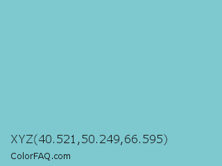 XYZ 40.521,50.249,66.595 Color is a light cyan color and the nearest color is Half Baked #85c4cc. Hex code #7ec8cf and RGB value is rgb(126,200,207). In RGB color space, this color is composed of 49% red, 78% green, 81% blue, In CMYK color space, this color is composed of 39% cyan, 3% magenta, 0% yellow , 19% black , In HSL color space, this color has a hue angle of 185° , 46% saturation and 65% lightness.