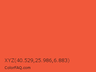 XYZ 40.529,25.986,6.883 Color is a normal red color and the nearest color is Orange Soda #fa5b3d. Hex code #f1583a and RGB value is rgb(241,88,58). In RGB color space, this color is composed of 95% red, 35% green, 23% blue, In CMYK color space, this color is composed of 0% cyan, 63% magenta, 76% yellow , 5% black , In HSL color space, this color has a hue angle of 10° , 87% saturation and 59% lightness.
