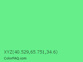 XYZ 40.529,65.751,34.6 Color is a light green color and the nearest color is Very Light Malachite Green #64e986. Hex code #65ee8a and RGB value is rgb(101,238,138). In RGB color space, this color is composed of 40% red, 93% green, 54% blue, In CMYK color space, this color is composed of 58% cyan, 0% magenta, 42% yellow , 7% black , In HSL color space, this color has a hue angle of 136° , 80% saturation and 66% lightness.