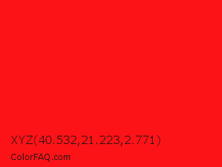 XYZ 40.532,21.223,2.771 Color is a normal red color and the nearest color is Vivid Red #f70d1a. Hex code #fc1317 and RGB value is rgb(252,19,23). In RGB color space, this color is composed of 99% red, 7% green, 9% blue, In CMYK color space, this color is composed of 0% cyan, 92% magenta, 91% yellow , 1% black , In HSL color space, this color has a hue angle of 359° , 97% saturation and 53% lightness.