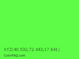 XYZ 40.532,72.443,17.641 Color is a light green color and the nearest color is Screamin Green #66ff66. Hex code #5efc46 and RGB value is rgb(94,252,70). In RGB color space, this color is composed of 37% red, 99% green, 27% blue, In CMYK color space, this color is composed of 63% cyan, 0% magenta, 72% yellow , 1% black , In HSL color space, this color has a hue angle of 112° , 97% saturation and 63% lightness.