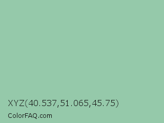 XYZ 40.537,51.065,45.75 Color is a light green color and the nearest color is Eton Blue #96c8a2. Hex code #95c9aa and RGB value is rgb(149,201,170). In RGB color space, this color is composed of 58% red, 79% green, 67% blue, In CMYK color space, this color is composed of 26% cyan, 0% magenta, 15% yellow , 21% black , In HSL color space, this color has a hue angle of 144° , 33% saturation and 69% lightness.