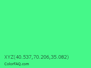 XYZ 40.537,70.206,35.082 Color is a light green color and the nearest color is Very Light Malachite Green #64e986. Hex code #45f889 and RGB value is rgb(69,248,137). In RGB color space, this color is composed of 27% red, 97% green, 54% blue, In CMYK color space, this color is composed of 72% cyan, 0% magenta, 45% yellow , 3% black , In HSL color space, this color has a hue angle of 143° , 93% saturation and 62% lightness.