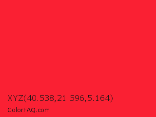 XYZ 40.538,21.596,5.164 Color is a normal red color and the nearest color is Imperial Red #ed2939. Hex code #fa2033 and RGB value is rgb(250,32,51). In RGB color space, this color is composed of 98% red, 13% green, 20% blue, In CMYK color space, this color is composed of 0% cyan, 87% magenta, 80% yellow , 2% black , In HSL color space, this color has a hue angle of 355° , 96% saturation and 55% lightness.