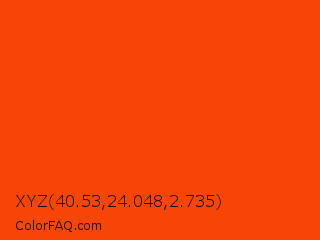 XYZ 40.53,24.048,2.735 Color is a normal color and the nearest color is Orange Red #ff4500. Hex code #f74508 and RGB value is rgb(247,69,8). In RGB color space, this color is composed of 97% red, 27% green, 3% blue, In CMYK color space, this color is composed of 0% cyan, 72% magenta, 97% yellow , 3% black , In HSL color space, this color has a hue angle of 15° , 94% saturation and 50% lightness.