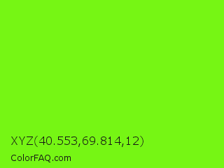 XYZ 40.553,69.814,12 Color is a normal green color and the nearest color is Lawn Green #7cfc00. Hex code #76f614 and RGB value is rgb(118,246,20). In RGB color space, this color is composed of 46% red, 96% green, 8% blue, In CMYK color space, this color is composed of 52% cyan, 0% magenta, 92% yellow , 4% black , In HSL color space, this color has a hue angle of 94° , 93% saturation and 52% lightness.