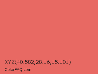 XYZ 40.582,28.16,15.101 Color is a light red color and the nearest color is Sunglo #e16865. Hex code #e86963 and RGB value is rgb(232,105,99). In RGB color space, this color is composed of 91% red, 41% green, 39% blue, In CMYK color space, this color is composed of 0% cyan, 55% magenta, 57% yellow , 9% black , In HSL color space, this color has a hue angle of 3° , 74% saturation and 65% lightness.