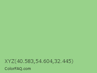 XYZ 40.583,54.604,32.445 Color is a light green color and the nearest color is Feijoa #9fdd8c. Hex code #98d28a and RGB value is rgb(152,210,138). In RGB color space, this color is composed of 60% red, 82% green, 54% blue, In CMYK color space, this color is composed of 28% cyan, 0% magenta, 34% yellow , 18% black , In HSL color space, this color has a hue angle of 108° , 44% saturation and 68% lightness.