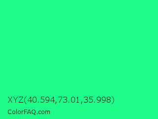XYZ 40.594,73.01,35.998 Color is a normal green color and the nearest color is Spring Green #00ff7f. Hex code #1ffe8a and RGB value is rgb(31,254,138). In RGB color space, this color is composed of 12% red, 100% green, 54% blue, In CMYK color space, this color is composed of 88% cyan, 0% magenta, 46% yellow , 0% black , In HSL color space, this color has a hue angle of 149° , 99% saturation and 56% lightness.