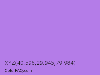 XYZ 40.596,29.945,79.984 Color is a light purple color and the nearest color is Lavender #b57edc. Hex code #b47ce8 and RGB value is rgb(180,124,232). In RGB color space, this color is composed of 71% red, 49% green, 91% blue, In CMYK color space, this color is composed of 22% cyan, 47% magenta, 0% yellow , 9% black , In HSL color space, this color has a hue angle of 271° , 70% saturation and 70% lightness.