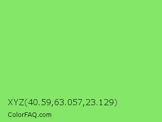 XYZ 40.59,63.057,23.129 Color is a light green color and the nearest color is Pastel Green #77dd77. Hex code #84e768 and RGB value is rgb(132,231,104). In RGB color space, this color is composed of 52% red, 91% green, 41% blue, In CMYK color space, this color is composed of 43% cyan, 0% magenta, 55% yellow , 9% black , In HSL color space, this color has a hue angle of 107° , 73% saturation and 66% lightness.