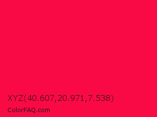 XYZ 40.607,20.971,7.538 Color is a normal red color and the nearest color is American Rose #ff033e. Hex code #fa0a45 and RGB value is rgb(250,10,69). In RGB color space, this color is composed of 98% red, 4% green, 27% blue, In CMYK color space, this color is composed of 0% cyan, 96% magenta, 72% yellow , 2% black , In HSL color space, this color has a hue angle of 345° , 96% saturation and 51% lightness.