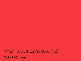 XYZ 40.614,22.939,6.702 Color is a normal red color and the nearest color is Coral Red #ff4040. Hex code #f7383d and RGB value is rgb(247,56,61). In RGB color space, this color is composed of 97% red, 22% green, 24% blue, In CMYK color space, this color is composed of 0% cyan, 77% magenta, 75% yellow , 3% black , In HSL color space, this color has a hue angle of 358° , 92% saturation and 59% lightness.