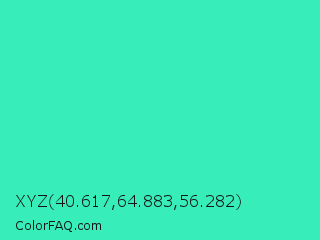 XYZ 40.617,64.883,56.282 Color is a normal green color and the nearest color is Turquoise #40e0d0. Hex code #37edb9 and RGB value is rgb(55,237,185). In RGB color space, this color is composed of 22% red, 93% green, 73% blue, In CMYK color space, this color is composed of 77% cyan, 0% magenta, 22% yellow , 7% black , In HSL color space, this color has a hue angle of 163° , 83% saturation and 57% lightness.