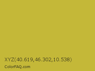 XYZ 40.619,46.302,10.538 Color is a normal yellow color and the nearest color is Earls Green #c9b93b. Hex code #c4b838 and RGB value is rgb(196,184,56). In RGB color space, this color is composed of 77% red, 72% green, 22% blue, In CMYK color space, this color is composed of 0% cyan, 6% magenta, 71% yellow , 23% black , In HSL color space, this color has a hue angle of 55° , 56% saturation and 49% lightness.