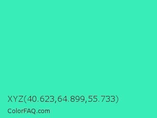 XYZ 40.623,64.899,55.733 Color is a normal green color and the nearest color is Turquoise #40e0d0. Hex code #39edb8 and RGB value is rgb(57,237,184). In RGB color space, this color is composed of 22% red, 93% green, 72% blue, In CMYK color space, this color is composed of 76% cyan, 0% magenta, 22% yellow , 7% black , In HSL color space, this color has a hue angle of 162° , 83% saturation and 58% lightness.