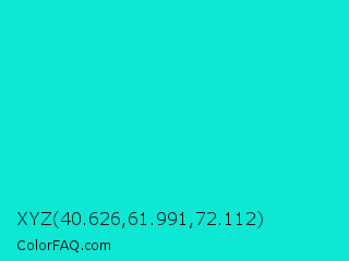 XYZ 40.626,61.991,72.112 Color is a normal cyan color and the nearest color is Bright Turquoise #08e8de. Hex code #0de7d4 and RGB value is rgb(13,231,212). In RGB color space, this color is composed of 5% red, 91% green, 83% blue, In CMYK color space, this color is composed of 94% cyan, 0% magenta, 8% yellow , 9% black , In HSL color space, this color has a hue angle of 175° , 89% saturation and 48% lightness.
