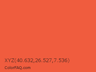 XYZ 40.632,26.527,7.536 Color is a normal red color and the nearest color is Orange Soda #fa5b3d. Hex code #f05c3e and RGB value is rgb(240,92,62). In RGB color space, this color is composed of 94% red, 36% green, 24% blue, In CMYK color space, this color is composed of 0% cyan, 62% magenta, 74% yellow , 6% black , In HSL color space, this color has a hue angle of 10° , 86% saturation and 59% lightness.