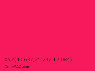 XYZ 40.637,21.242,12.084 Color is a normal rose color and the nearest color is Awesome #ff2052. Hex code #f7195c and RGB value is rgb(247,25,92). In RGB color space, this color is composed of 97% red, 10% green, 36% blue, In CMYK color space, this color is composed of 0% cyan, 90% magenta, 63% yellow , 3% black , In HSL color space, this color has a hue angle of 342° , 93% saturation and 53% lightness.
