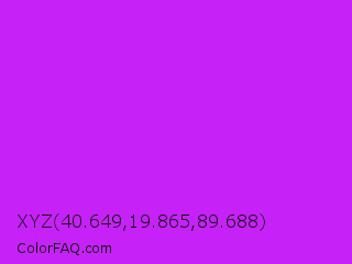 XYZ 40.649,19.865,89.688 Color is a normal purple color and the nearest color is Vivid Mulberry #b80ce3. Hex code #c622f7 and RGB value is rgb(198,34,247). In RGB color space, this color is composed of 78% red, 13% green, 97% blue, In CMYK color space, this color is composed of 20% cyan, 86% magenta, 0% yellow , 3% black , In HSL color space, this color has a hue angle of 286° , 93% saturation and 55% lightness.