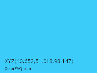 XYZ 40.652,51.018,98.147 Color is a light blue color and the nearest color is Picton Blue #45b1e8. Hex code #3bccfa and RGB value is rgb(59,204,250). In RGB color space, this color is composed of 23% red, 80% green, 98% blue, In CMYK color space, this color is composed of 76% cyan, 18% magenta, 0% yellow , 2% black , In HSL color space, this color has a hue angle of 194° , 95% saturation and 61% lightness.