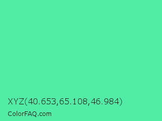 XYZ 40.653,65.108,46.984 Color is a light green color and the nearest color is Eucalyptus #44d7a8. Hex code #51eda7 and RGB value is rgb(81,237,167). In RGB color space, this color is composed of 32% red, 93% green, 65% blue, In CMYK color space, this color is composed of 66% cyan, 0% magenta, 30% yellow , 7% black , In HSL color space, this color has a hue angle of 153° , 81% saturation and 62% lightness.
