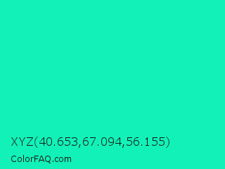 XYZ 40.653,67.094,56.155 Color is a normal cyan color and the nearest color is Medium Spring Green #00fa9a. Hex code #12f2b8 and RGB value is rgb(18,242,184). In RGB color space, this color is composed of 7% red, 95% green, 72% blue, In CMYK color space, this color is composed of 93% cyan, 0% magenta, 24% yellow , 5% black , In HSL color space, this color has a hue angle of 164° , 90% saturation and 51% lightness.