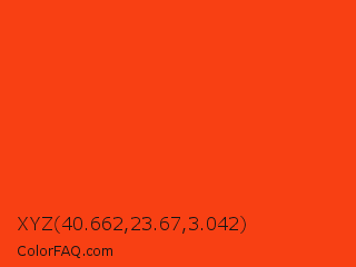 XYZ 40.662,23.67,3.042 Color is a normal red color and the nearest color is Orioles Orange #fb4f14. Hex code #f84013 and RGB value is rgb(248,64,19). In RGB color space, this color is composed of 97% red, 25% green, 7% blue, In CMYK color space, this color is composed of 0% cyan, 74% magenta, 92% yellow , 3% black , In HSL color space, this color has a hue angle of 12° , 94% saturation and 52% lightness.