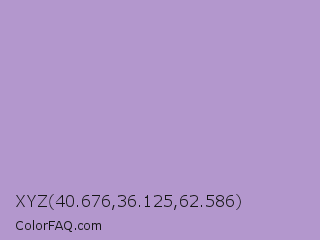 XYZ 40.676,36.125,62.586 Color is a light purple color and the nearest color is East Side #ac91ce. Hex code #b397cd and RGB value is rgb(179,151,205). In RGB color space, this color is composed of 70% red, 59% green, 80% blue, In CMYK color space, this color is composed of 13% cyan, 26% magenta, 0% yellow , 20% black , In HSL color space, this color has a hue angle of 271° , 35% saturation and 70% lightness.