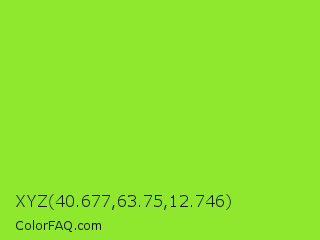 XYZ 40.677,63.75,12.746 Color is a normal green color and the nearest color is Kiwi #8ee53f. Hex code #8fe82e and RGB value is rgb(143,232,46). In RGB color space, this color is composed of 56% red, 91% green, 18% blue, In CMYK color space, this color is composed of 38% cyan, 0% magenta, 80% yellow , 9% black , In HSL color space, this color has a hue angle of 89° , 80% saturation and 55% lightness.