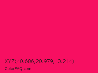 XYZ 40.686,20.979,13.214 Color is a normal rose color and the nearest color is Vivid Raspberry #ff006c. Hex code #f70f61 and RGB value is rgb(247,15,97). In RGB color space, this color is composed of 97% red, 6% green, 38% blue, In CMYK color space, this color is composed of 0% cyan, 94% magenta, 61% yellow , 3% black , In HSL color space, this color has a hue angle of 339° , 94% saturation and 51% lightness.