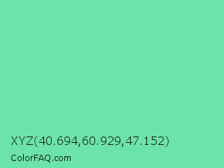 XYZ 40.694,60.929,47.152 Color is a light green color and the nearest color is Medium Aquamarine #66ddaa. Hex code #6be3a9 and RGB value is rgb(107,227,169). In RGB color space, this color is composed of 42% red, 89% green, 66% blue, In CMYK color space, this color is composed of 53% cyan, 0% magenta, 26% yellow , 11% black , In HSL color space, this color has a hue angle of 151° , 68% saturation and 65% lightness.