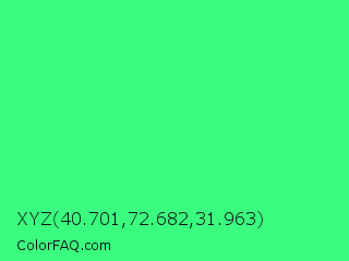XYZ 40.701,72.682,31.963 Color is a light green color and the nearest color is Very Light Malachite Green #64e986. Hex code #3afd7f and RGB value is rgb(58,253,127). In RGB color space, this color is composed of 23% red, 99% green, 50% blue, In CMYK color space, this color is composed of 77% cyan, 0% magenta, 50% yellow , 1% black , In HSL color space, this color has a hue angle of 141° , 98% saturation and 61% lightness.