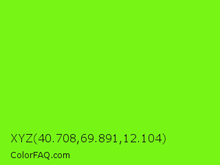 XYZ 40.708,69.891,12.104 Color is a normal green color and the nearest color is Lawn Green #7cfc00. Hex code #77f616 and RGB value is rgb(119,246,22). In RGB color space, this color is composed of 47% red, 96% green, 9% blue, In CMYK color space, this color is composed of 52% cyan, 0% magenta, 91% yellow , 4% black , In HSL color space, this color has a hue angle of 94° , 93% saturation and 53% lightness.