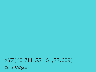 XYZ 40.711,55.161,77.609 Color is a normal cyan color and the nearest color is Viking #64ccdb. Hex code #52d6de and RGB value is rgb(82,214,222). In RGB color space, this color is composed of 32% red, 84% green, 87% blue, In CMYK color space, this color is composed of 63% cyan, 4% magenta, 0% yellow , 13% black , In HSL color space, this color has a hue angle of 183° , 68% saturation and 60% lightness.