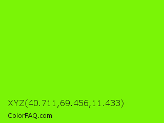 XYZ 40.711,69.456,11.433 Color is a normal green color and the nearest color is Lawn Green #7cfc00. Hex code #7af506 and RGB value is rgb(122,245,6). In RGB color space, this color is composed of 48% red, 96% green, 2% blue, In CMYK color space, this color is composed of 50% cyan, 0% magenta, 98% yellow , 4% black , In HSL color space, this color has a hue angle of 91° , 95% saturation and 49% lightness.