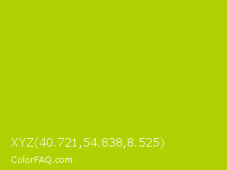 XYZ 40.721,54.838,8.525 Color is a normal yellow color and the nearest color is Vivid Lime Green #a6d608. Hex code #b0d103 and RGB value is rgb(176,209,3). In RGB color space, this color is composed of 69% red, 82% green, 1% blue, In CMYK color space, this color is composed of 16% cyan, 0% magenta, 99% yellow , 18% black , In HSL color space, this color has a hue angle of 70° , 97% saturation and 42% lightness.
