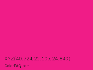 XYZ 40.724,21.105,24.849 Color is a normal rose color and the nearest color is Barbie Pink #e0218a. Hex code #f01c87 and RGB value is rgb(240,28,135). In RGB color space, this color is composed of 94% red, 11% green, 53% blue, In CMYK color space, this color is composed of 0% cyan, 88% magenta, 44% yellow , 6% black , In HSL color space, this color has a hue angle of 330° , 88% saturation and 53% lightness.