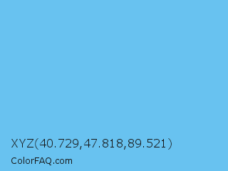 XYZ 40.729,47.818,89.521 Color is a light blue color and the nearest color is Maya Blue #73c2fb. Hex code #68c2f0 and RGB value is rgb(104,194,240). In RGB color space, this color is composed of 41% red, 76% green, 94% blue, In CMYK color space, this color is composed of 57% cyan, 19% magenta, 0% yellow , 6% black , In HSL color space, this color has a hue angle of 200° , 82% saturation and 67% lightness.