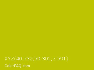 XYZ 40.732,50.301,7.591 Color is a normal yellow color and the nearest color is Rio Grande #bbd009. Hex code #bdc401 and RGB value is rgb(189,196,1). In RGB color space, this color is composed of 74% red, 77% green, 0% blue, In CMYK color space, this color is composed of 4% cyan, 0% magenta, 99% yellow , 23% black , In HSL color space, this color has a hue angle of 62° , 99% saturation and 39% lightness.