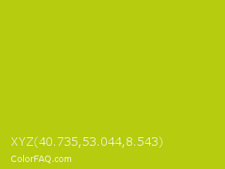 XYZ 40.735,53.044,8.543 Color is a normal yellow color and the nearest color is Rio Grande #bbd009. Hex code #b5cc0f and RGB value is rgb(181,204,15). In RGB color space, this color is composed of 71% red, 80% green, 6% blue, In CMYK color space, this color is composed of 11% cyan, 0% magenta, 93% yellow , 20% black , In HSL color space, this color has a hue angle of 67° , 86% saturation and 43% lightness.