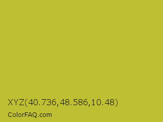 XYZ 40.736,48.586,10.48 Color is a normal yellow color and the nearest color is Earls Green #c9b93b. Hex code #bfbf34 and RGB value is rgb(191,191,52). In RGB color space, this color is composed of 75% red, 75% green, 20% blue, In CMYK color space, this color is composed of 0% cyan, 0% magenta, 73% yellow , 25% black , In HSL color space, this color has a hue angle of 60° , 57% saturation and 48% lightness.