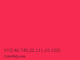 XYZ 40.745,22.111,10.103 Color is a normal red color and the nearest color is Awesome #ff2052. Hex code #f72b52 and RGB value is rgb(247,43,82). In RGB color space, this color is composed of 97% red, 17% green, 32% blue, In CMYK color space, this color is composed of 0% cyan, 83% magenta, 67% yellow , 3% black , In HSL color space, this color has a hue angle of 349° , 93% saturation and 57% lightness.