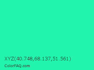 XYZ 40.748,68.137,51.561 Color is a normal green color and the nearest color is Medium Spring Green #00fa9a. Hex code #22f4af and RGB value is rgb(34,244,175). In RGB color space, this color is composed of 13% red, 96% green, 69% blue, In CMYK color space, this color is composed of 86% cyan, 0% magenta, 28% yellow , 4% black , In HSL color space, this color has a hue angle of 160° , 91% saturation and 55% lightness.