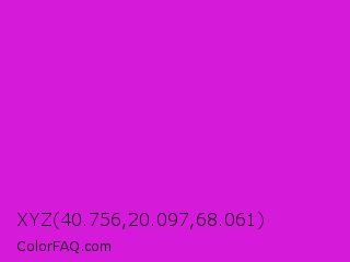 XYZ 40.756,20.097,68.061 Color is a normal magenta color and the nearest color is Steel Pink #cc33cc. Hex code #d61ada and RGB value is rgb(214,26,218). In RGB color space, this color is composed of 84% red, 10% green, 85% blue, In CMYK color space, this color is composed of 2% cyan, 88% magenta, 0% yellow , 15% black , In HSL color space, this color has a hue angle of 299° , 79% saturation and 48% lightness.