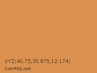 XYZ 40.75,35.875,12.174 Color is a normal orange color and the nearest color is Persian Orange #d99058. Hex code #db914f and RGB value is rgb(219,145,79). In RGB color space, this color is composed of 86% red, 57% green, 31% blue, In CMYK color space, this color is composed of 0% cyan, 34% magenta, 64% yellow , 14% black , In HSL color space, this color has a hue angle of 28° , 66% saturation and 58% lightness.